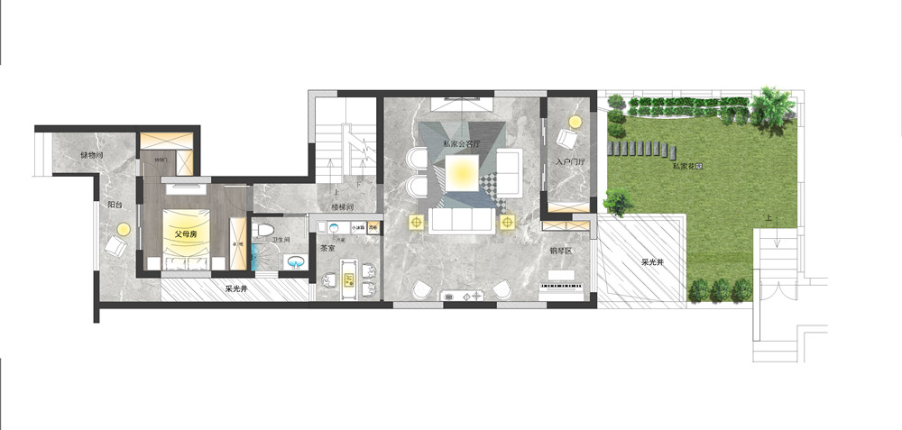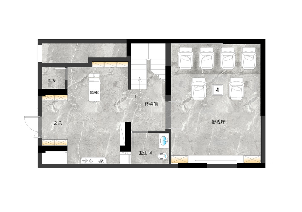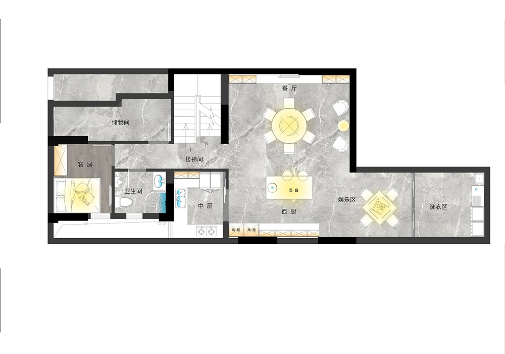 此设计为星麓原洋房底跃,面积330平方,常驻5口人家,负一楼层高为5860毫米,可以做现浇设计成两层,负二楼设计为影视厅,健身区,把厨房改造负一楼,使空间合理利用,有一个客房考虑在负一楼,不常住,吃饭娱乐,一楼设计为会客厅,茶区,父母房,父母年龄大了,尽量少走楼梯,二楼就是主卧,女儿房,还有次卧。