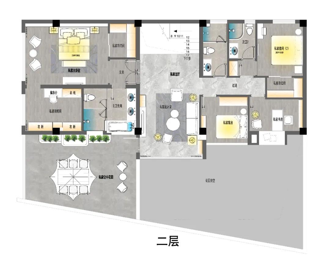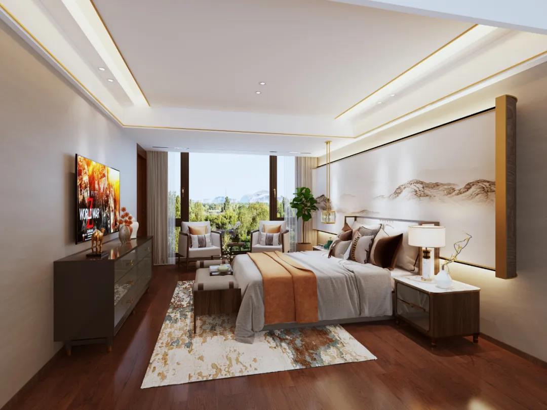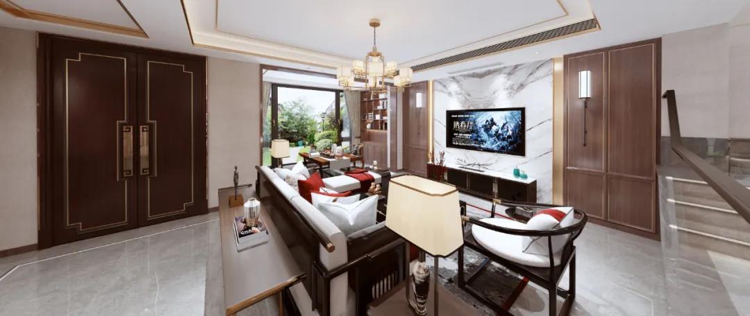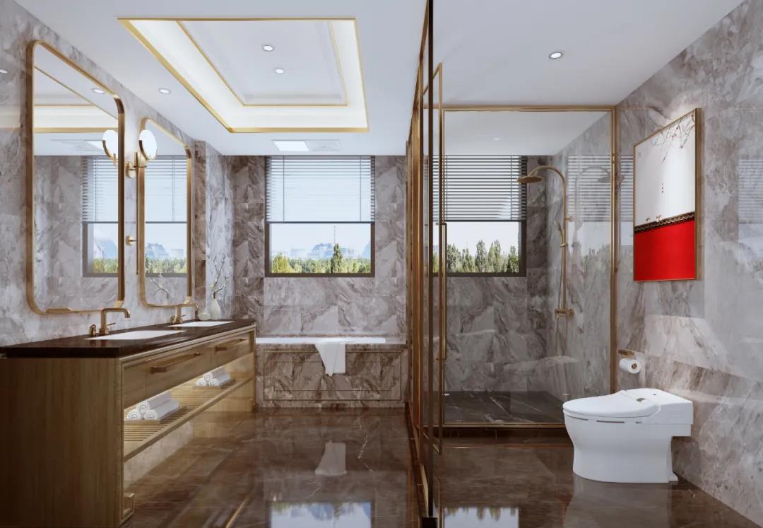 主卫采用双台盆的设计,方便主人进行梳洗打扮。浴缸、淋浴间、马桶均单独隔开,尽可能减少卫生间的积水情况,保持卫生间的清洁,方便打扫,也是为了健康。除此之外,卫生间的装潢均采用黄铜金属、大理石花纹,打造出奢华之感。