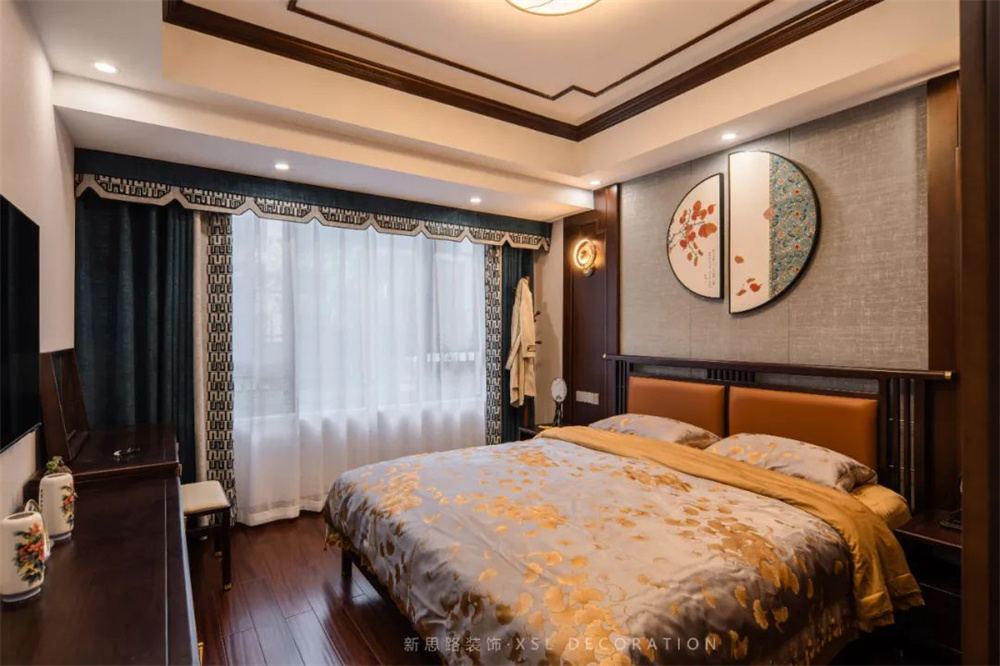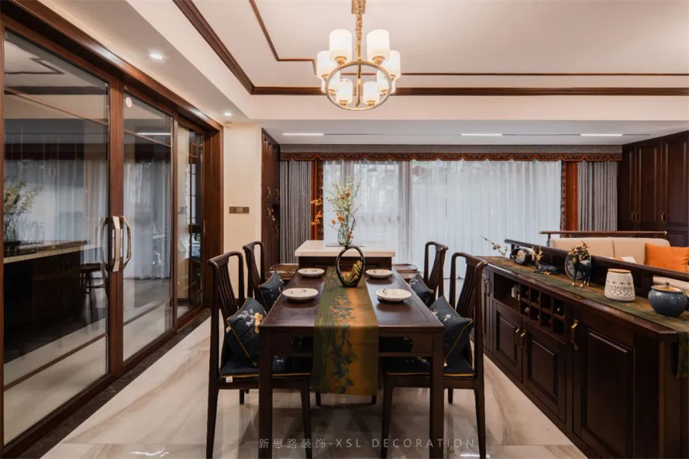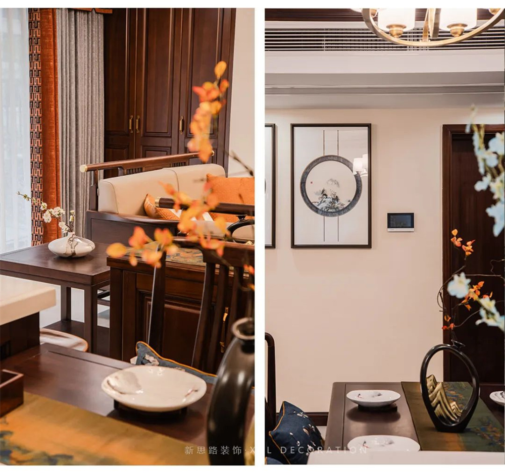 入户玄关的视觉点用景和物做隔断,半开半合中将视线引向内部空间,餐厅使用木色与厨房空间氛围为一体,餐桌上采用“清明上河图”布饰加以山水瓶插花营造出大气氛围;暖色微醺的光源散漫折射照其上,撩拨平静的心绪,荡起一丝涟漪。明亮色彩的碰撞,传递中式意蕴及趣味的同时,激活味蕾的感知;丝绸布艺与盘扣的细节点缀,调和深木色的沉闷印象,内敛延绵。
