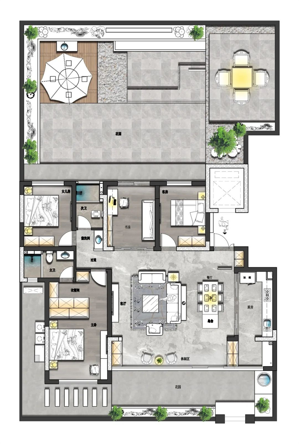 3、将卧室改为书房,书房到后花园打通做玻璃滑门,更方便;书房和客厅打通做镂空隔断,更通透。