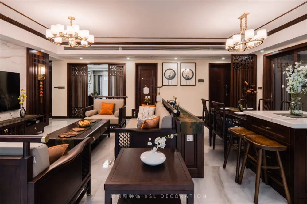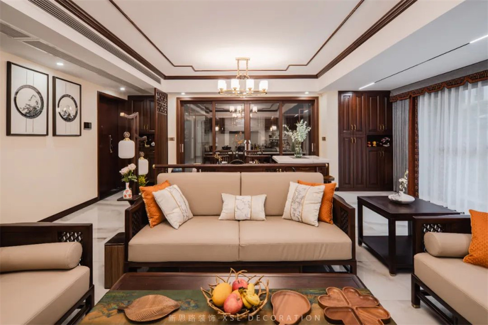 客厅空间衍脉自深厚邈远的传统文化,从家具的形制、流线、色泽,到墨枝斜逸、山掩人家的山水挂画,均镌刻着东方诗性的肌理,流露出自信大方的悠悠风骨。融合现代主义的简约与传统东方的形韵,令空间沾染着雅秀的气质,清净有格调。