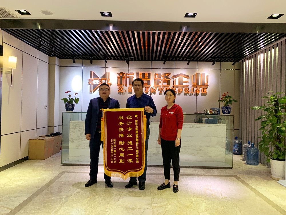 5月4日上午,公装项目英中耐(重庆)公司段总,为新思路送上一面大红锦旗。“设计专业、施工一流;服务热情、耐心周到”这16个字充分体现出对我们ANBO.COM公装部的设计、施工及服务的高度认可。