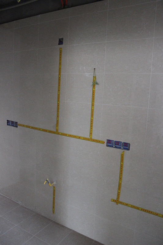 质检正在认真检查墙面贴砖情况