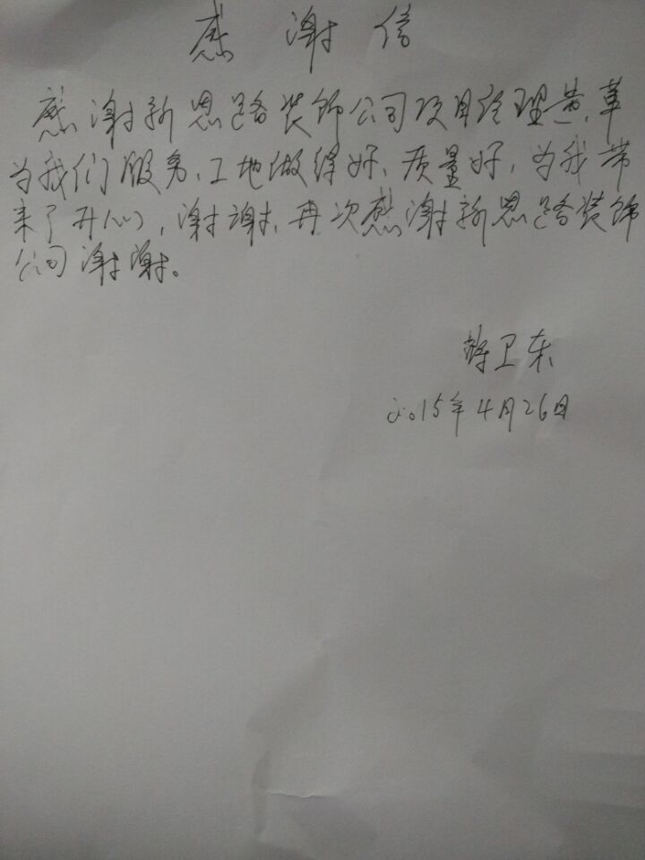 金杯银杯不如客户的口碑,这封感谢信虽然只是公司所获荣誉的点滴,但这将激励我们更加努力,不断提升服务和施工品质,打造出更多的“品质工程”、“样板工程”,来回报我们的客户。