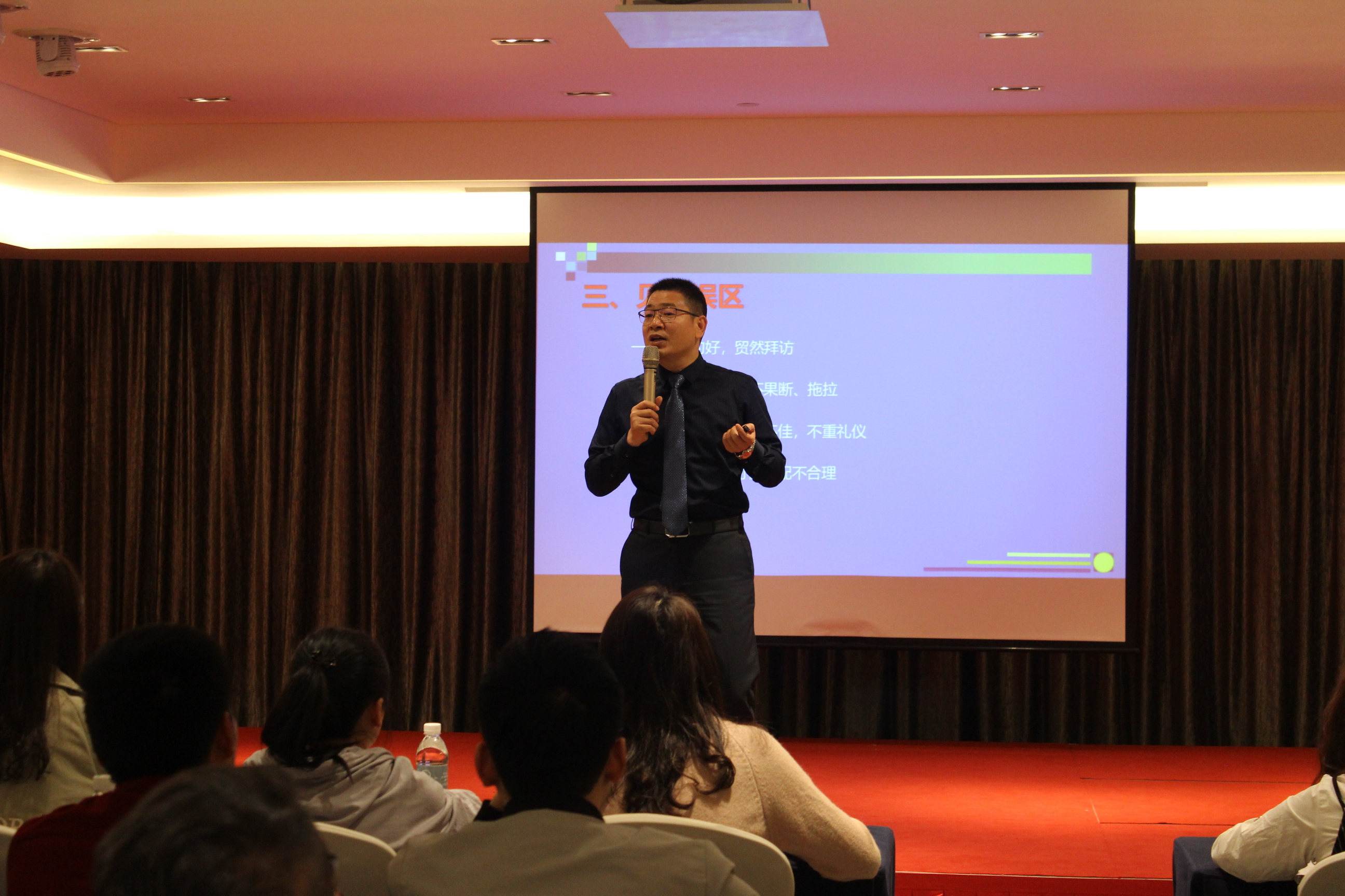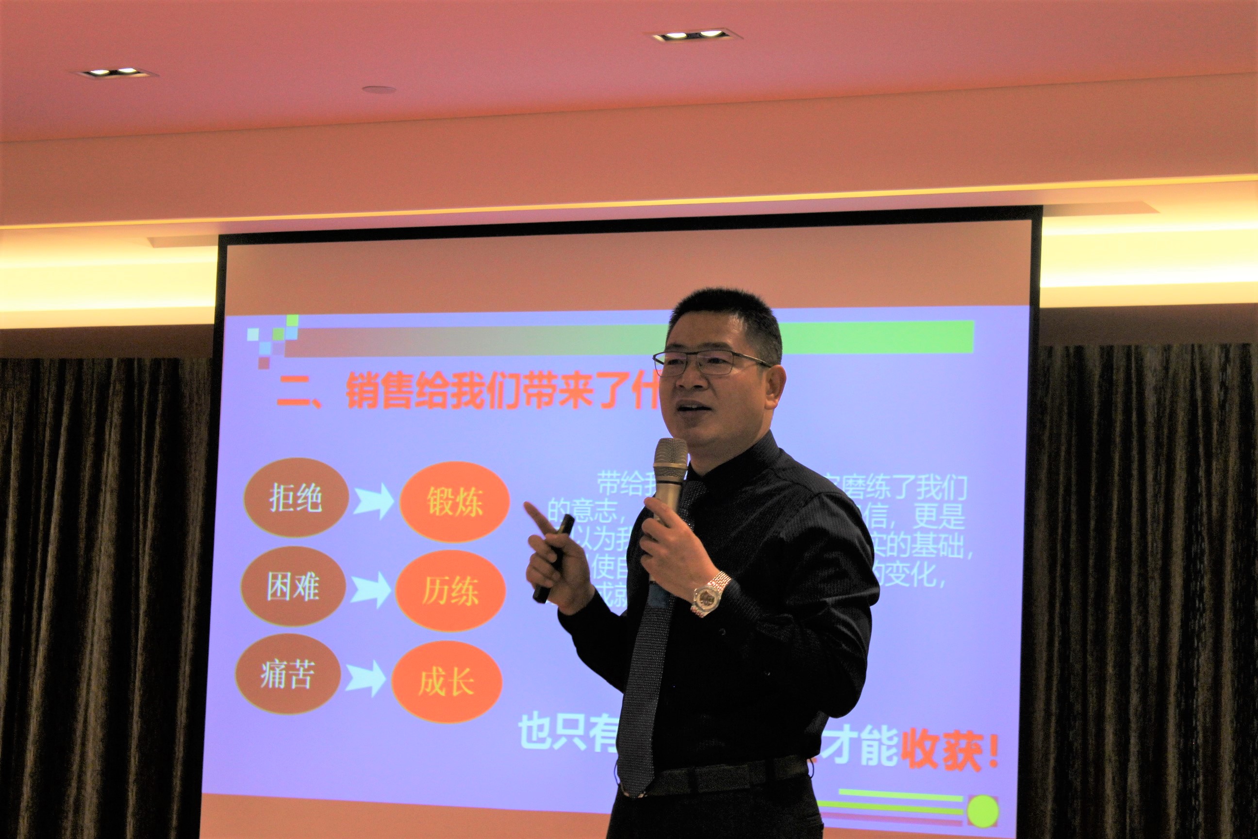 张总的这次《销售精英特训营》培训会讲得非常精彩,深入浅出地分析我们销售人的不易和困难,深刻全面地总结了销售人在工作中遇到的种种问题和误区。销售不仅仅是一种职业,更是一种生活方式!张总讲到:销售带给我们的是一种过程,过程中有辛酸、有苦难,但恰恰是这种过程磨练了我们的意志和能力,这样我们就会更加强大、自信!因为痛才是历练,苦才能成长,也只有苦难的过程才能有收获!