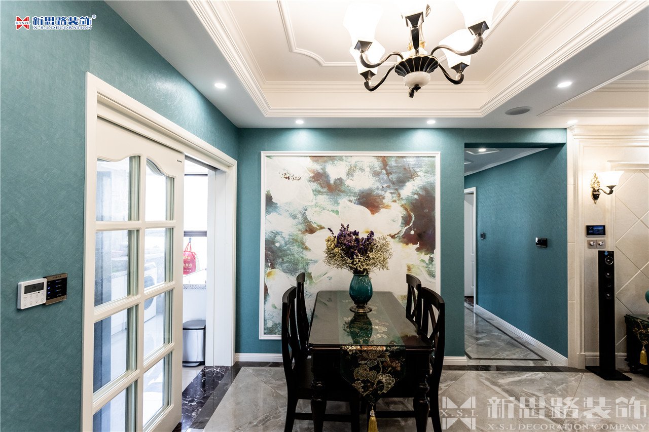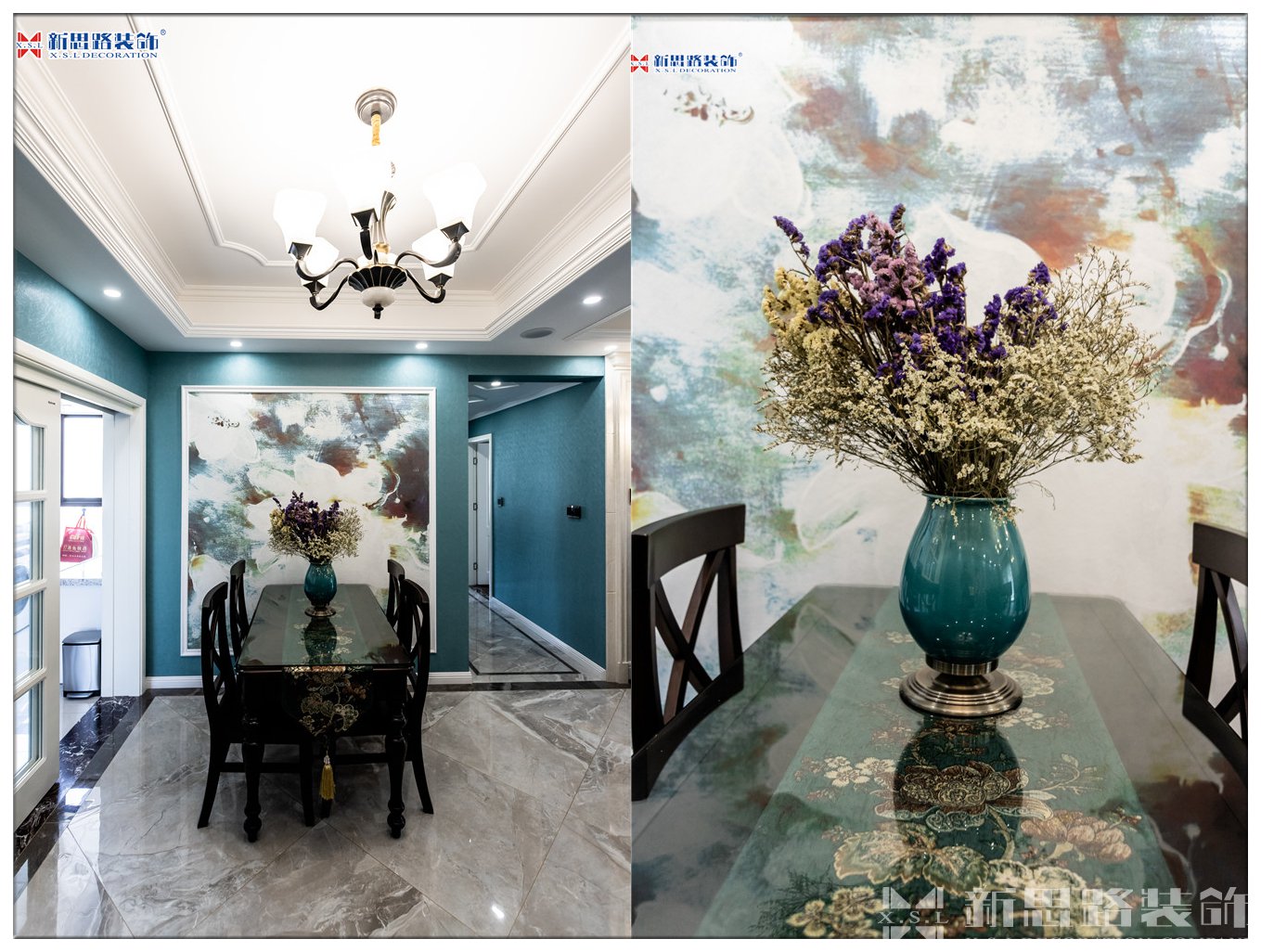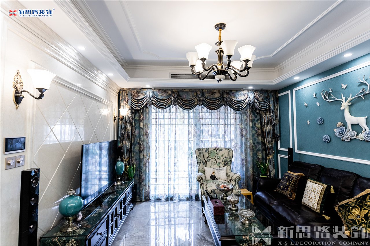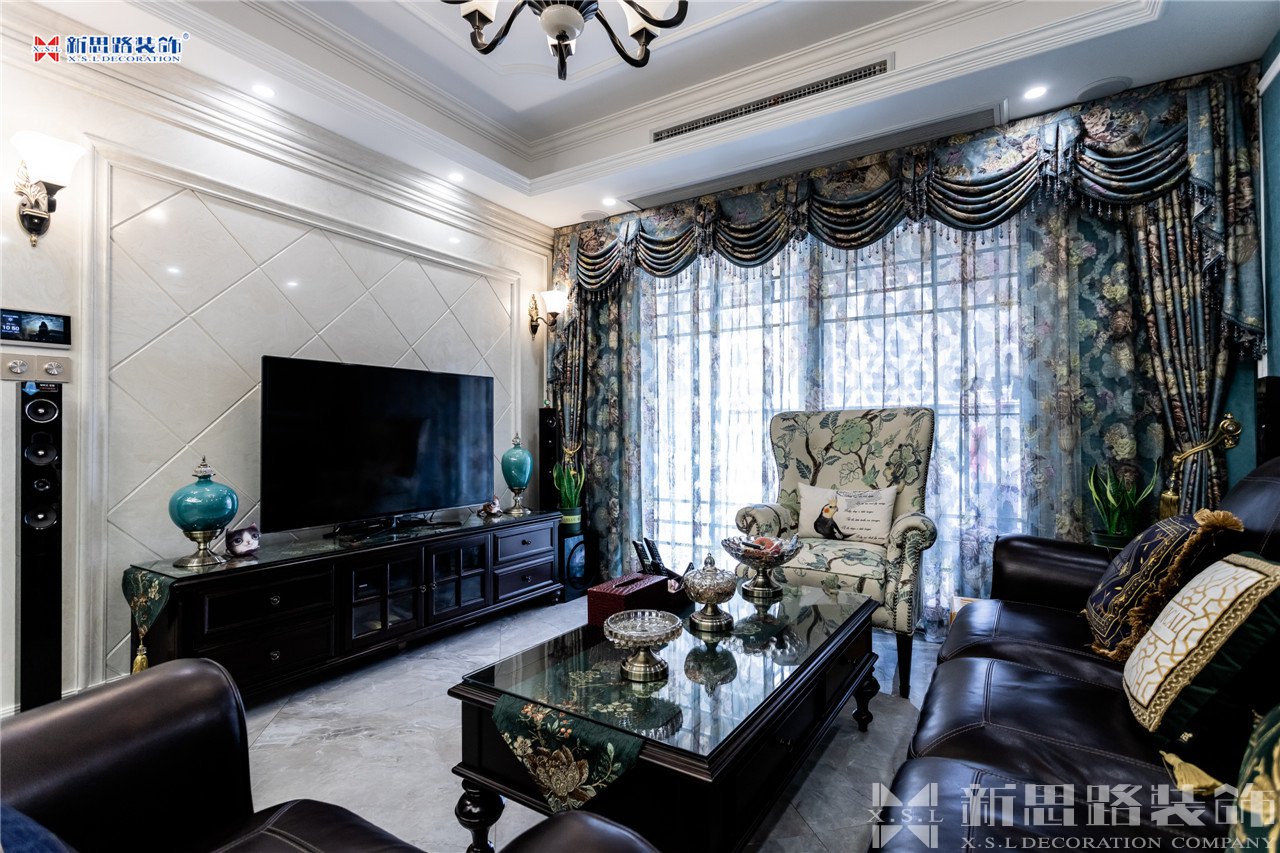 沙发背景墙使用石膏线材勾画几何图形,古典优雅;陶瓷的小鹿漫步花间,野趣横生。复古花色的窗帘与真皮质地的沙发以及实木电视柜搭配起来正合适,线条分割成菱形网格状的乳白色电视背景墙大方低调,黄铜色美式吊灯干净明亮。深墨绿色的织锦桌旗无形中又添了点奢华意味,油青色的仿古装饰摆件也是非常经典的美式元素体现。