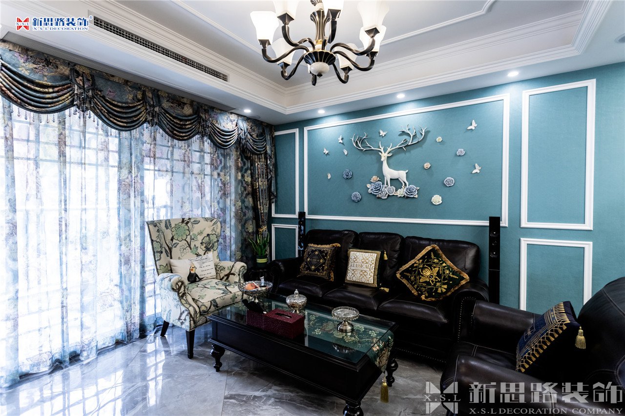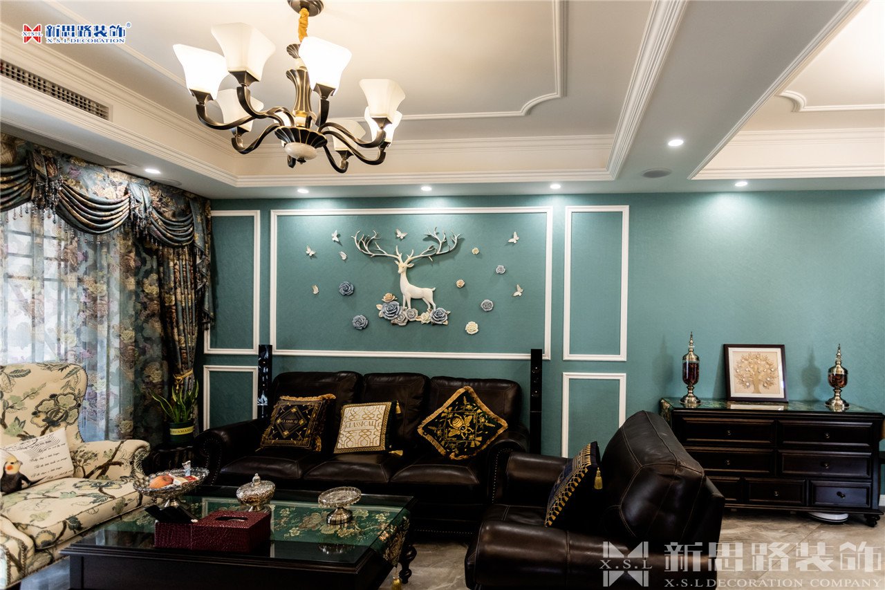 因为想营造出美式风格中的复古历史感,所以我们选取了颜色很深的琉璃绿色打造整体墙面,客厅再用深浅不同的墨绿色系与深棕色系来进行装饰。