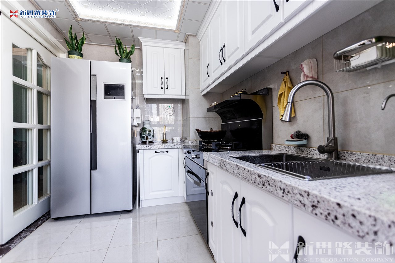 厨房灶台使用白色大理石材质打造,料理台的设计更方便食物的制作。橱柜颜色也选取了同色系的白色,清新干净,让本是油烟满满的厨房视觉上看起来明亮整洁。