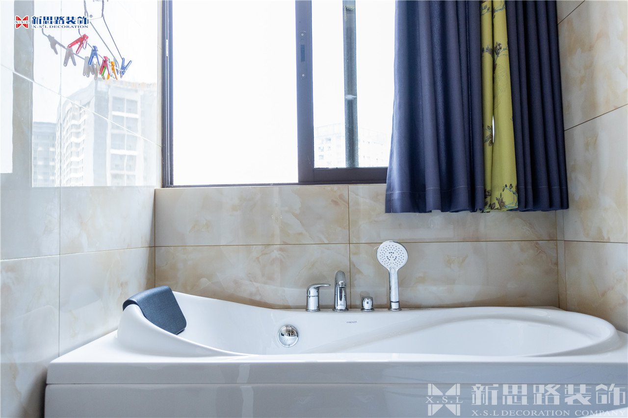 深色木质家具与复古风的装饰正是美式装修风格的亮点之一,深青色的皮质床头与墙面色系相统一。卫生间的浴缸设计非常适合休息之时放松泡澡,桌子上的上永生花与盆栽点缀房间,生机勃勃。