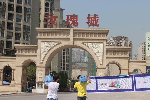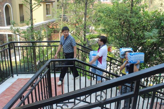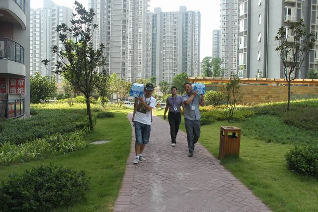 张总及慰问小组一行扛起水向东方雅郡小区施工工地进发送水