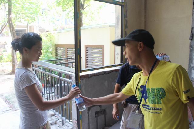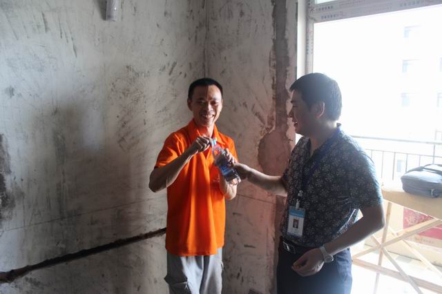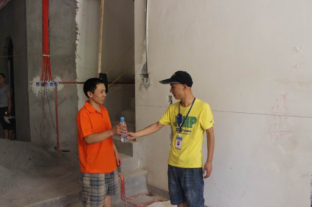 工程质检亲自将矿泉水送到工人师傅手中