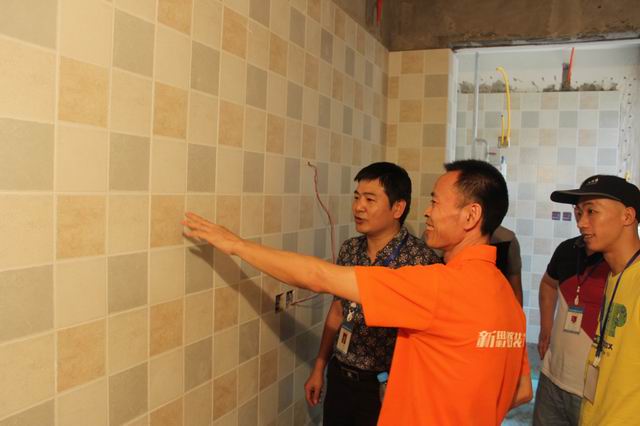 工人师傅在向张总及慰问小组一行汇报自己贴砖工艺及工作情况