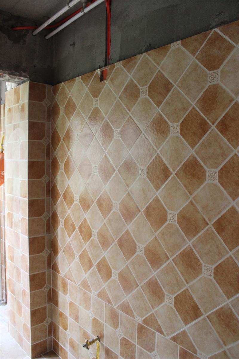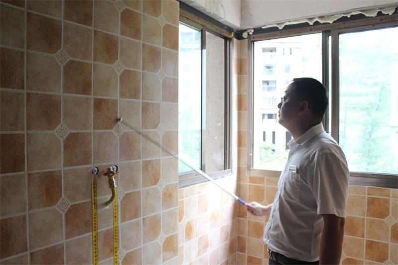 文经理正在认真检查墙砖铺贴情况