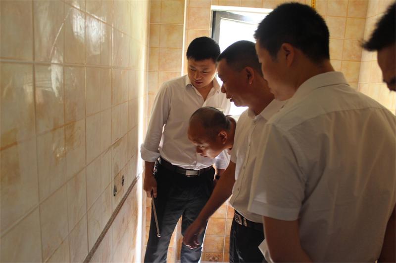 巡查成员正在仔细检查卫生间给水管施工情况