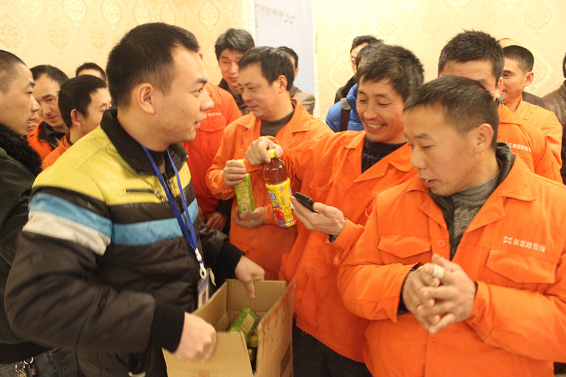 质检正在给工人师傅们发放饮品,这体现了新思路以人为本的企业文化