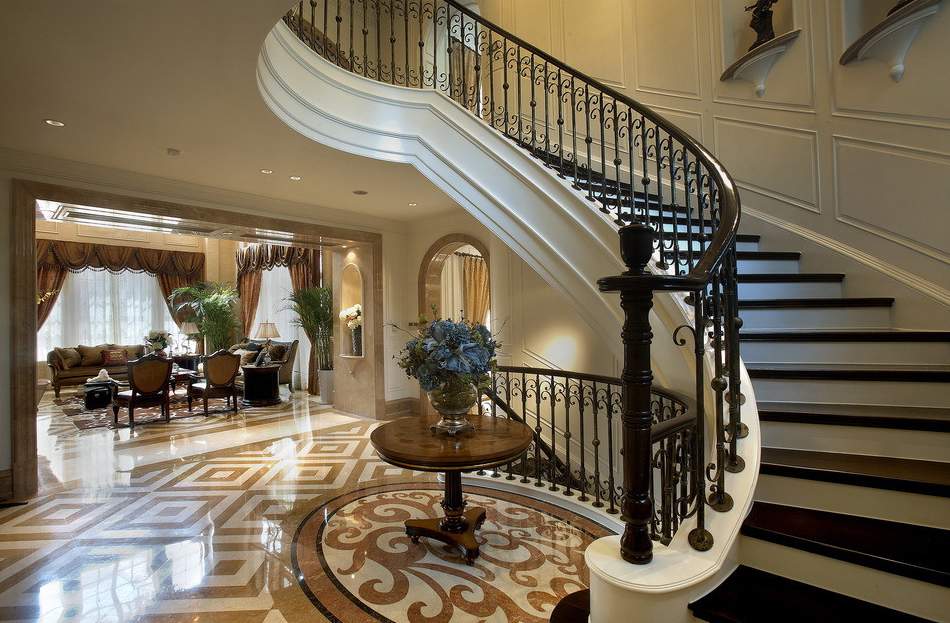 4.旋转梯。这种楼梯造型生动,富于变化,节约空间,它常常成为空间中的景观,成为不可分割的构图组件,它的材料可以是混凝土、钢材,甚至是有机玻璃的,现代的材料更宜于表现旋转梯的流动、轻盈的特点。在室内设计阶段应考虑到旋转梯的形态多变而带来的工艺方面的难度,应根据现有的机具、商场、经济等因素合理地选择材质和造型。